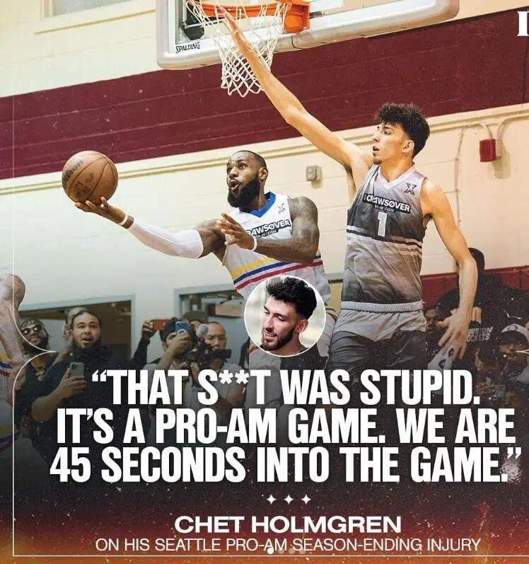 2022年榜眼切特,他在一场野球局防守詹姆斯时脚下一滑扭伤脚踝。之后雷霆官宣,切特手术修复了右脚跖跗关节伤势,赛季报销。